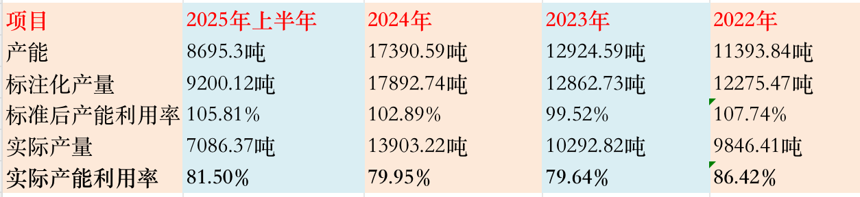 值得注意的是,在计算产销率时,公司选择以实际产量为分母,得出相对较高的产销率数据。报告期内,公司实际销量分别为9791.59吨、9992.32吨、14127.39吨和6976.95吨,据此计算的产销率分别为99.44%、97.08%、101.61%和98.46%。