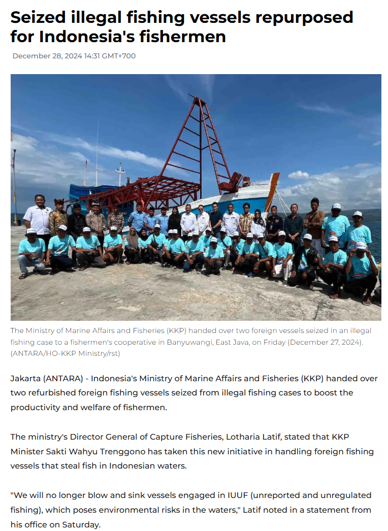 2024年12月28日,据安卡拉通讯社报道,印尼海洋事务与渔业部(KKP)向渔民捐赠了两艘翻新的外国渔船,这些渔船是从被裁定为非法捕捞的案件中查获的。该部门渔业捕捞总局局长洛萨里亚·拉蒂夫当时表示,印尼“将不再击沉从事非法、未报告和不受管制的捕捞活动的船只,(因为)这些活动对水域环境构成风险”。
