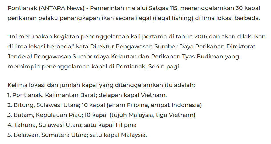 2016年2月22日,安塔拉通讯社早先报道有30艘船在印尼5个海域被击沉,后又补充在勿拉湾还有一艘伯利兹的渔船被击沉。